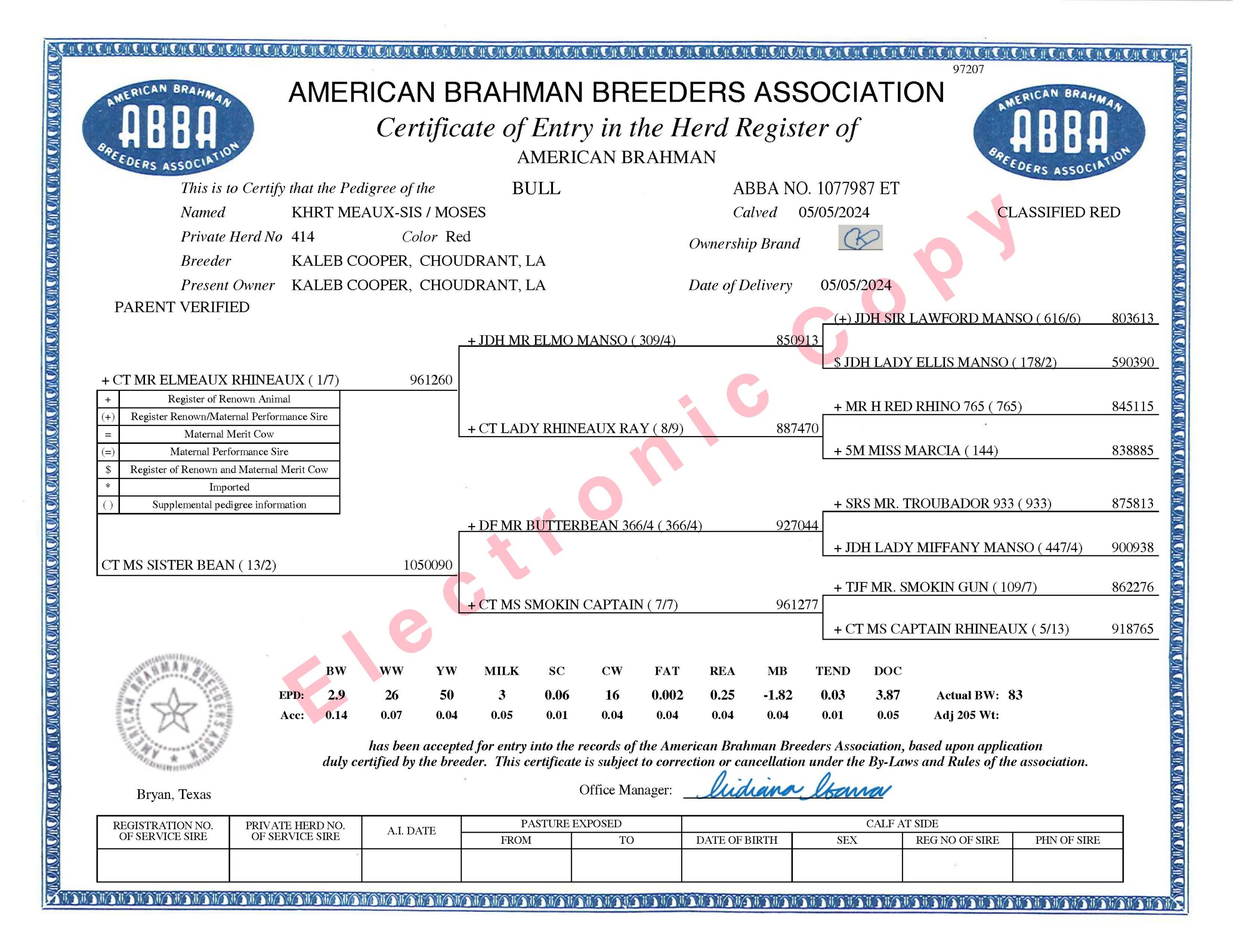 DESCRIPTION: ABBA: 1077987 • DOB: 05/05/2024 • Sire: +CT MR ELMEAUX RHINEAUX 1/7 • Dam: +CT MS SISTER BEAN 13/2