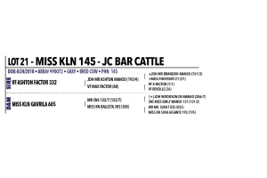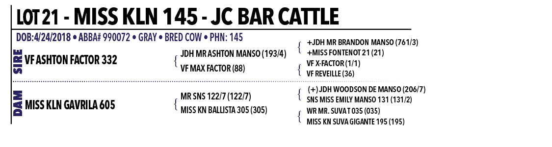 CONSIGNED BY: JC BAR CATTLEMiss KLN 145 from JC Bar Cattle Company represents an exciting offering from first-time consignors, and it is cattle like this that make a prestigious sale of this caliber possible, bringing together great people and great genetics in one place. This super cool female is a true powerhouse that can add value to a wide range of programs, catching your eye immediately with her impressive dimension, bold shape, and overall mass and balance. Pedigree-wise, she is built with intention, being sired by VF Ashton Factor 332, an own son of JDH Mr. Ashton Manso, who traces back to the influential +JDH Mr. Brandon Manso and the proven +Miss Fontenot 21, adding depth and consistency on the top side. Her maternal side is equally strong, as her dam, Miss KLN Gavrila 605, is sired by Mr. SNS 122/7, a (+)JDH Woodson De Manso son, and out of SNS Miss Emily Manso 131, a daughter of the renowned +BNA Double Take Manso, creating a powerful blend of performance and maternal strength. As an added bonus, Miss KLN 145 will sell confirmed bred to JH Mr. Bud Huff Jr. 18 (P), offering immediate value and future opportunity to her next owner. This is the kind of female that fits both the present and the future, whether you are looking to strengthen a cow herd, build replacements, or add proven genetics with momentum already behind them. When you step back and look at the whole package, Miss KLN 145 stands as a complete, well-rounded offering that deserves serious consideration on sale day.