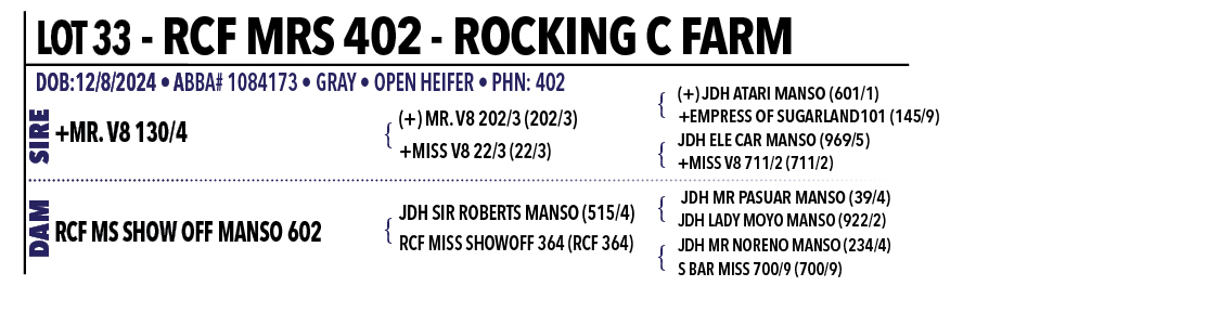RCF Mrs. 402 is a female that immediately draws attention, combining striking presence, substance, and a smooth, functional design that promises both longevity and productivity for years to come. She comes from returning consignors Rockin C Farm, who we greatly appreciate for trusting us again and bringing such quality genetics to this year’s sale. On the top side, she is sired by the powerful +Mr. V8 130/4, an own son of (+)Mr. V8 202/3 and out of a JDH Ele Car Manso daughter, +Miss V8 22/3, blending elite growth, maternal strength, and proven performance in a pedigree that has consistently produced cattle that impress both visually and on paper. Her dam, RCF Ms. Show Off Manso 602, adds even more depth and consistency, being sired by JDH Sir Robert Manso and out of a JDH Sir Noreno Manso daughter, RCF Miss Showoff 364, creating a foundation of maternal power, structural correctness, and herd-building potential. Beyond her outstanding genetics, RCF Mrs. 402 also ranks at the top of the breed for weaning weight, carcass weight, marbling, and $Queen Index, making her not only visually impressive but also a proven performer on paper. She combines eye appeal, femininity, and the kind of gentle, easy-handling temperament that makes her a pleasure to work with. Whether you are seeking a future donor female, a cornerstone of your cow herd, or an animal that combines both performance and pedigree, RCF Mrs. 402 delivers on every level and is a female that deserves serious attention on sale day.